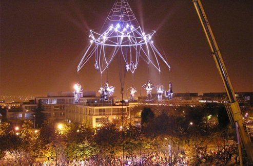 Slowly the ball began to rise from the street, percussion musicians suspended above from its edges. They hung like Christmas tree ornaments, lit up in the dusk while they took on their crazy characters. The acrobats were perched up above them, and the musicians played different chimes and bell sounds along with drums to keep the wonderfully strange pace. As the performance went on, the ball opened from the bottom like a flower, a musician on the end of each petal. Then it spun like a merry go round, or a Christmas decoration that spins under an open flame.