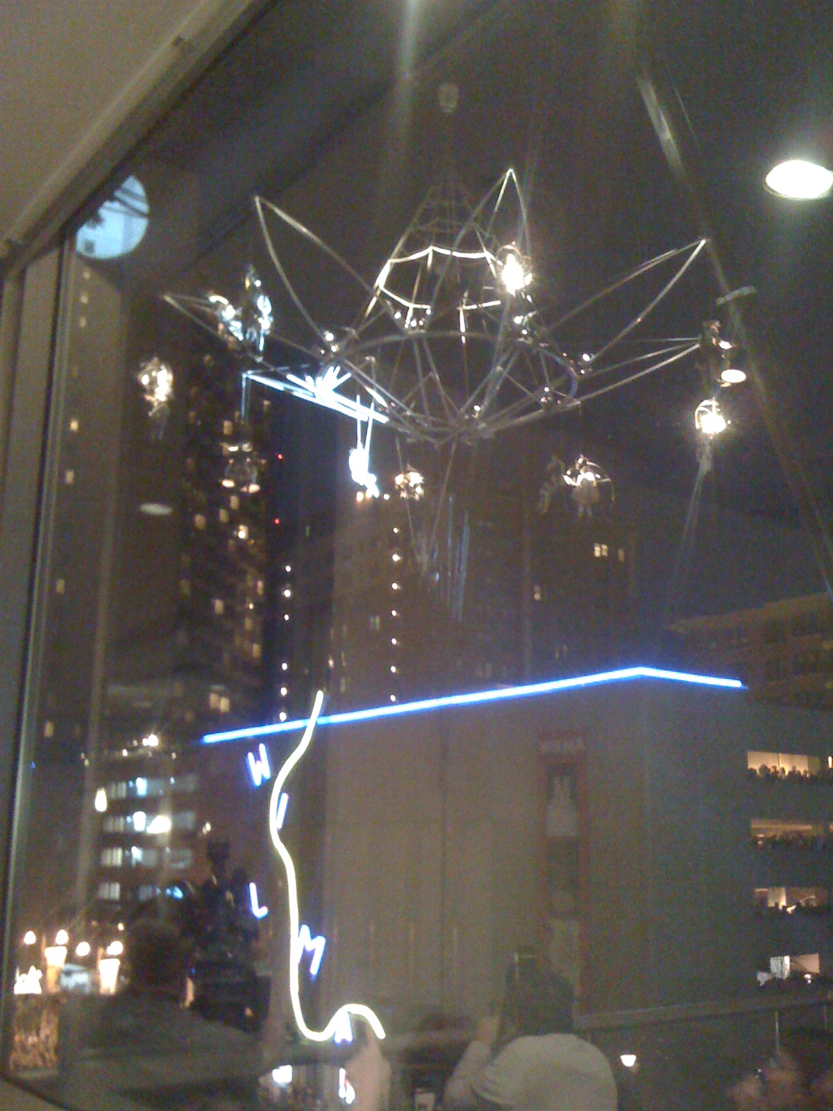 The musicians continued to play until the acrobats began their incredible show, gracefully showing their balletic strength. Later they moved mechanically like dolls, dancing on top of the music box. They were lit with spotlights from the bottom, casting their shadows on the high rises on Broad Street. As they moved, we moved, to another time.